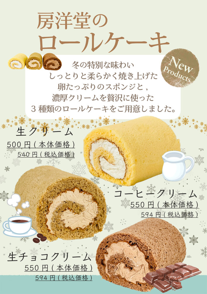 12月13日より房洋堂イオン館山店にて新商品・ケーキを販売開始となります。