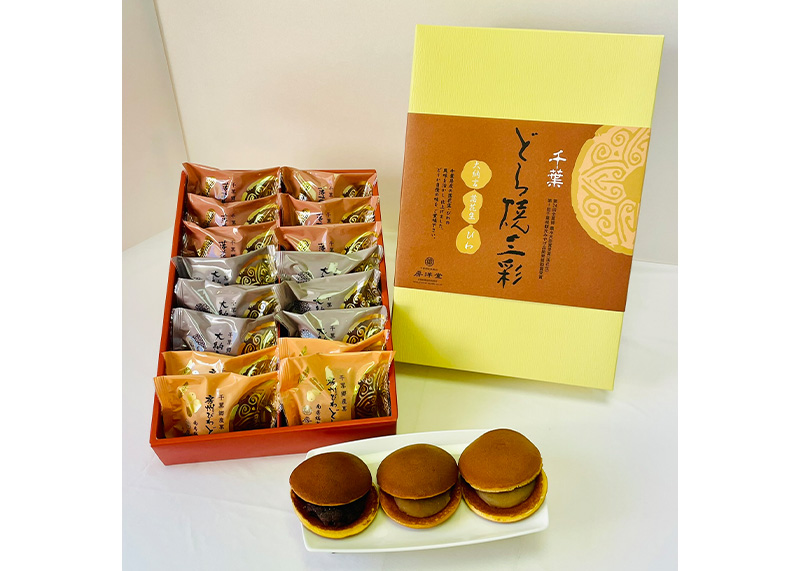 こちらの商品は、どら焼三彩(どらやきさんさい)になります。日本の代表的和菓子と言えるどら焼き。大納言あずきのつぶ餡、落花生入りの白餡、びわの餡、三種類の詰合せです。 大納言どら焼きは、北海道産のあずきを使用し、昔ながらの甘くて美味しいつぶ餡のどら焼です。落花生どら焼は、千葉県産の落花生を使用し、白餡の中に落花生を練りこんであり、落花生の風味が感じられて美味しいです。房州びわどら焼は、南房総市産のびわを餡に練りこみ、甘さも程よく美味しいです。