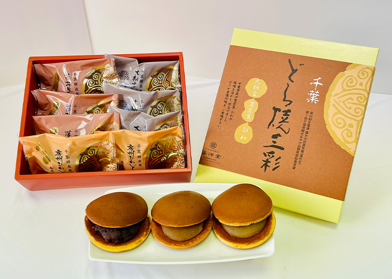 こちらの商品は、どら焼三彩(どらやきさんさい)になります。日本の代表的和菓子と言えるどら焼き。大納言あずきのつぶ餡、落花生入りの白餡、びわの餡、三種類の詰合せです。 大納言どら焼きは、北海道産のあずきを使用し、昔ながらの甘くて美味しいつぶ餡のどら焼です。落花生どら焼は、千葉県産の落花生を使用し、白餡の中に落花生を練りこんであり、落花生の風味が感じられて美味しいです。房州びわどら焼は、南房総市産のびわを餡に練りこみ、甘さも程よく美味しいです。